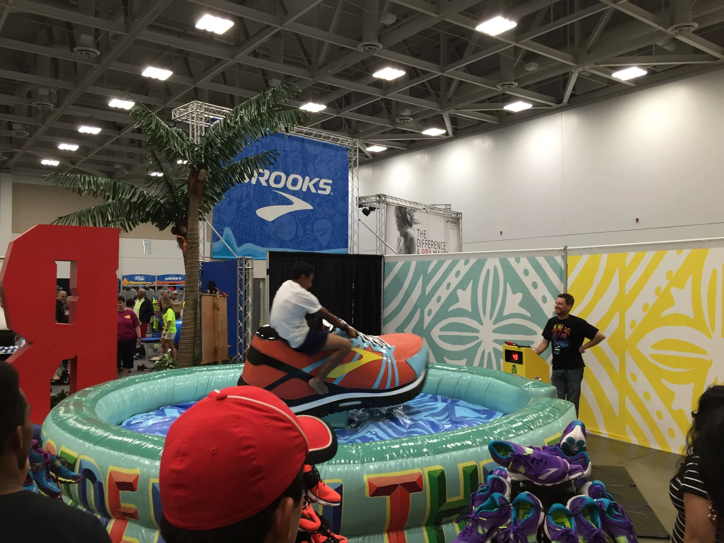 La expo de Virginia Beach era bastante estándar, algunos buenos productos, patrocinadores y por supuesto la marca deportiva que generalmente patrocina la carrera. Brooks en este caso era la marca deportiva patrocinadora y generalmente ponen un stand bastante amplio (RUN HAPPY), donde puedes montar un tennis para correr (estilo toro mecánico), también compites en carreras al estilo tapete de nintendo (donde presionas botones con los pies), entre otras cosas. Al centro hay una quiosco donde llenas varias encuestas sobre tus hábitos para correr y te genera un código (QR). Ese código lo usan para saber si ganas algún premio. Mientras caminaba por ahí tomando fotos para el recuerdo (y para este blog) generé mi numero para participar y... que me gano "el premio mayor".